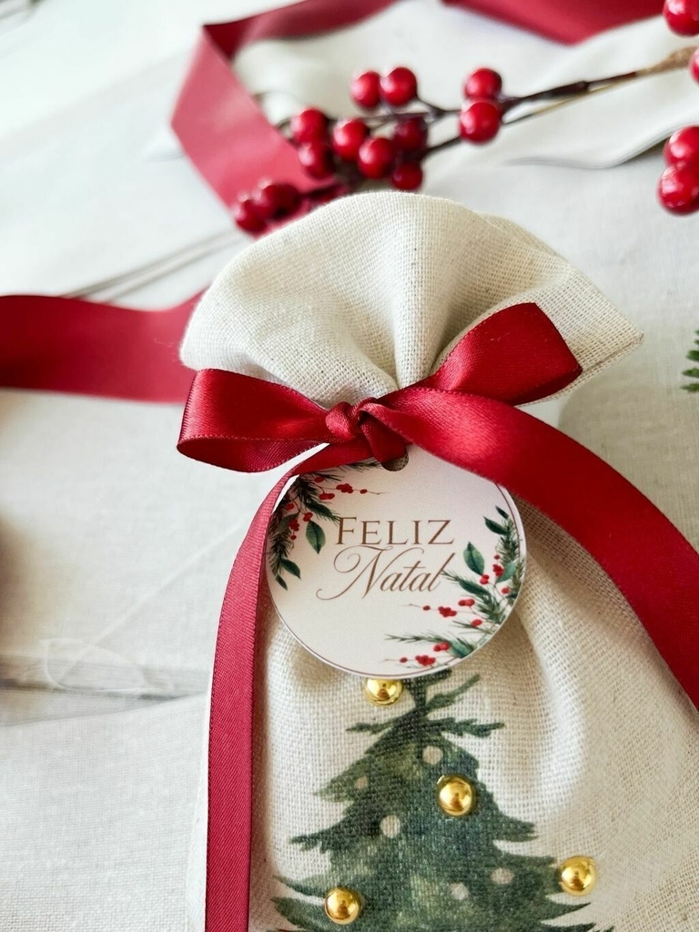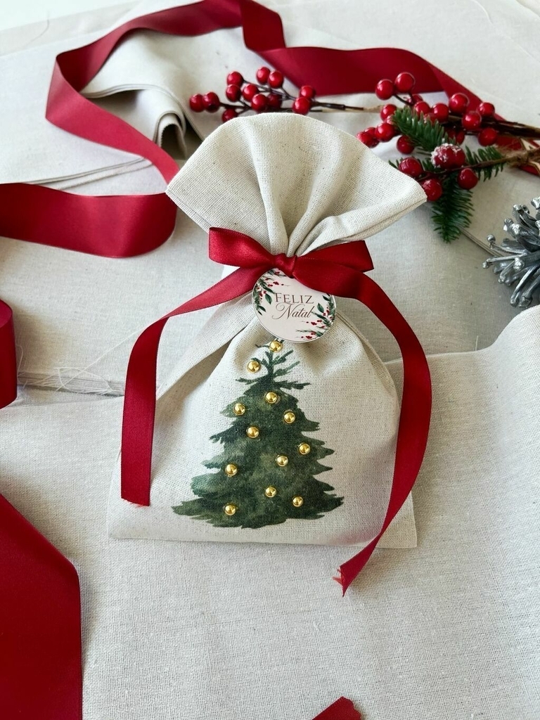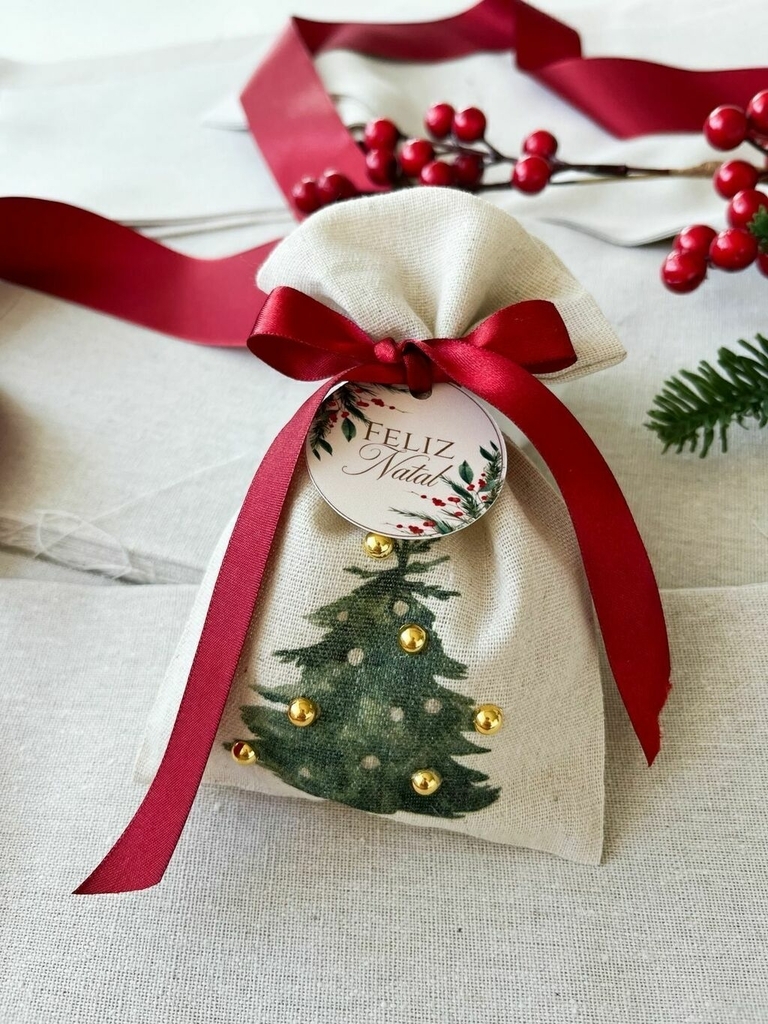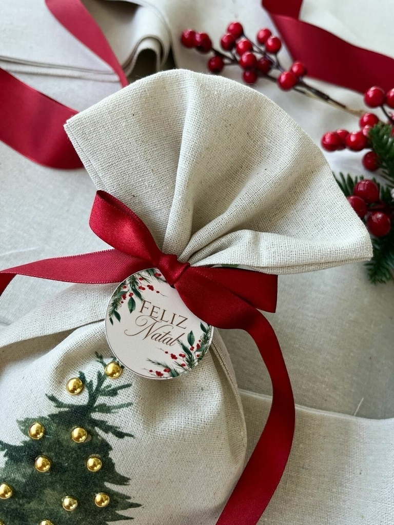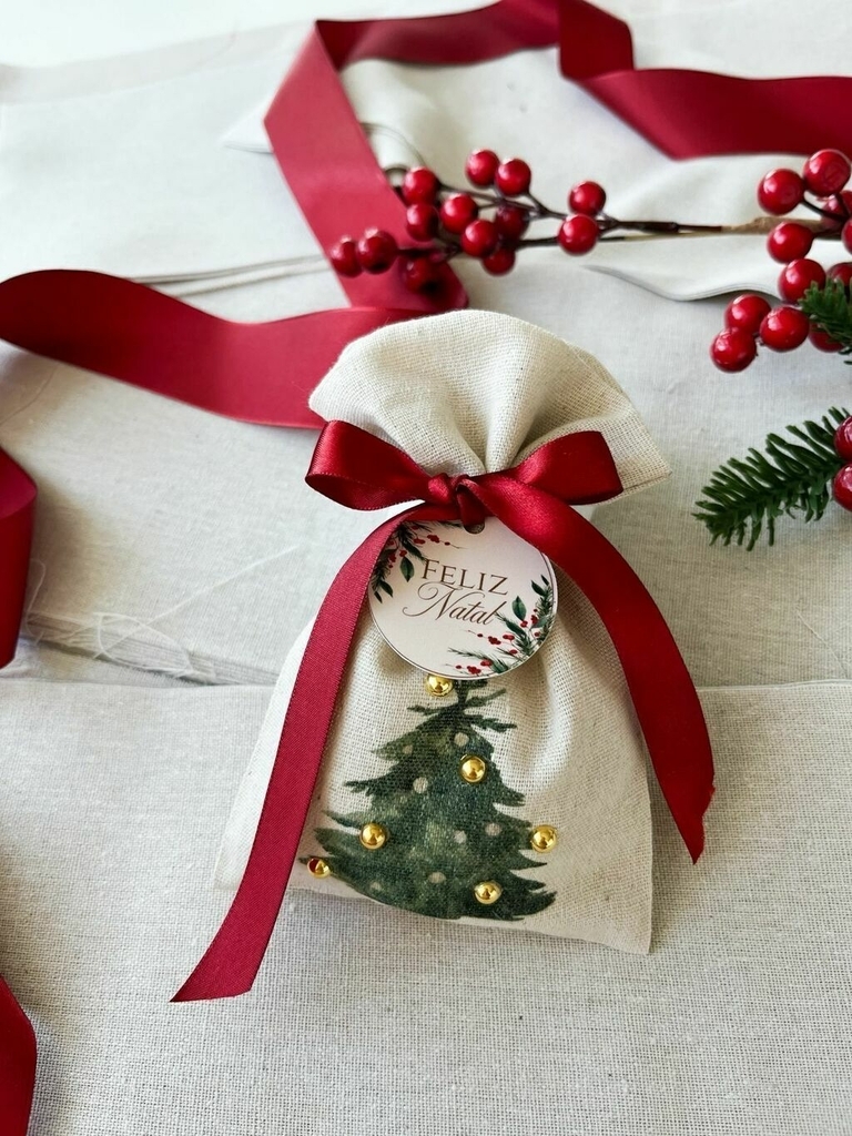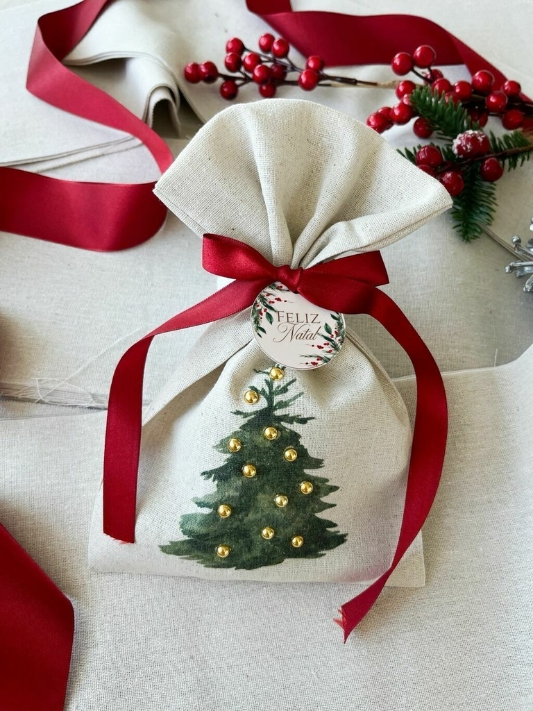 • 50  saquinhos de linho na cor natural Arvore e Pérolas Douradas