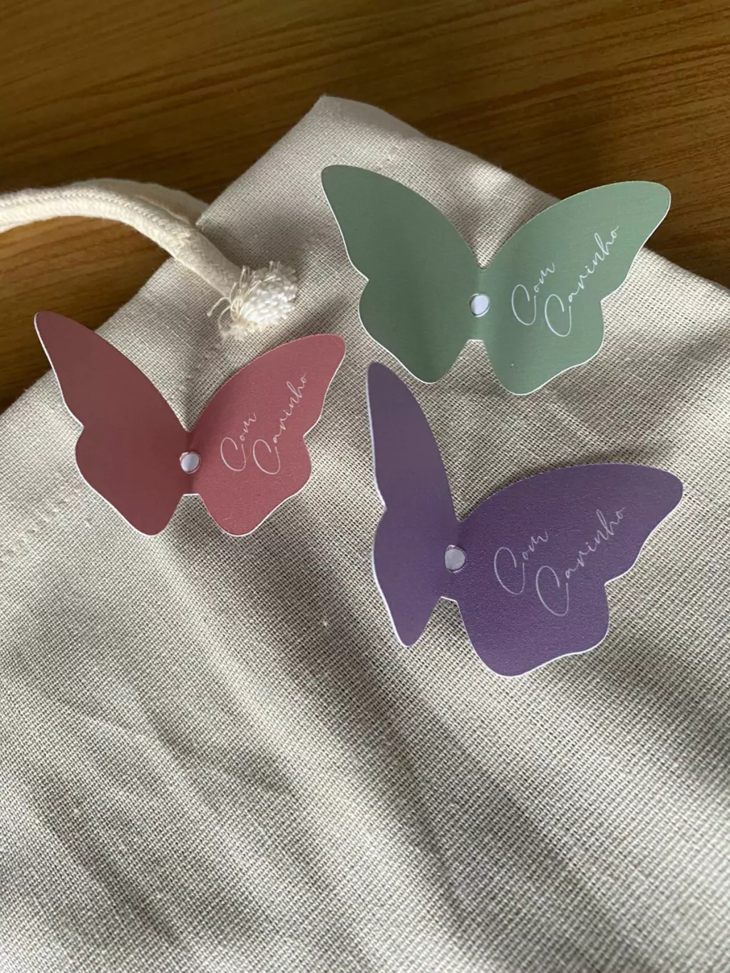 KIT COM 100 TAGS - Borboleta com Frase padrão ''COM CARINHO''.